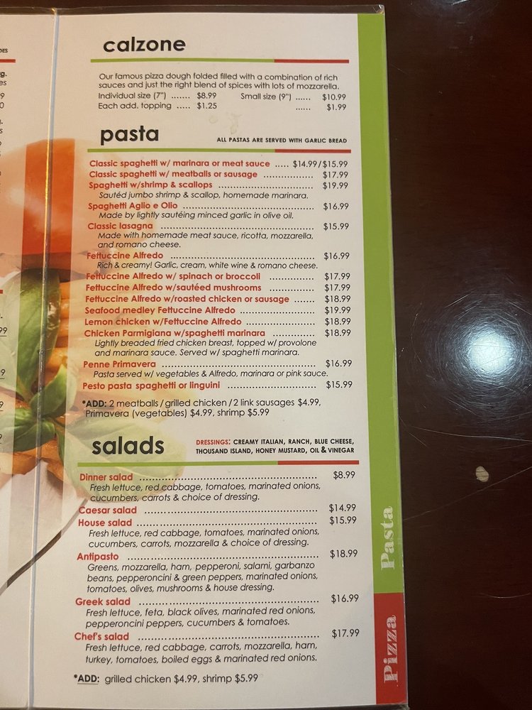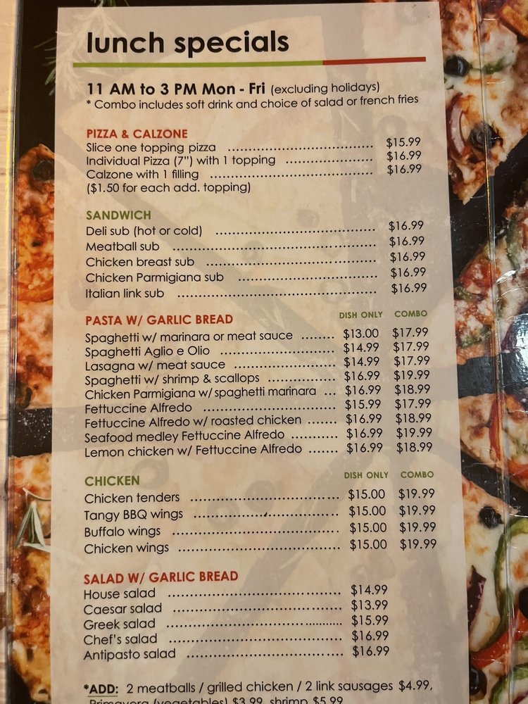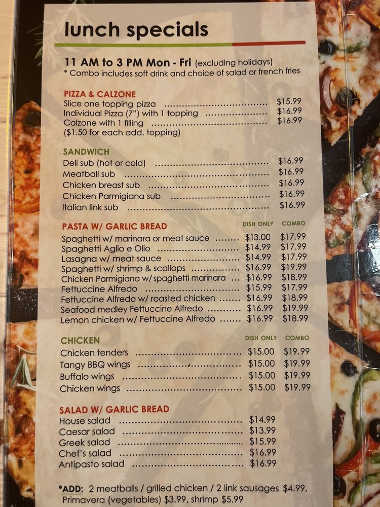 Served with spaghetti marinara. Includes soft drink and choice of salad or french fries.